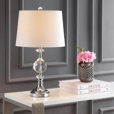Elevate your interior decor with the JONATHAN Y Channing Table Lamp, a masterpiece of the Channing collection that blends classic luxury with modern sophistication. This stunning fixture features a meticulously faceted crystal sphere that catches and refracts light to create a dazzling effect in any room. Paired with sleek chrome accents and a premium linen drum shade, this lamp serves as a functional work of art for your bedside, end table, or office desk.