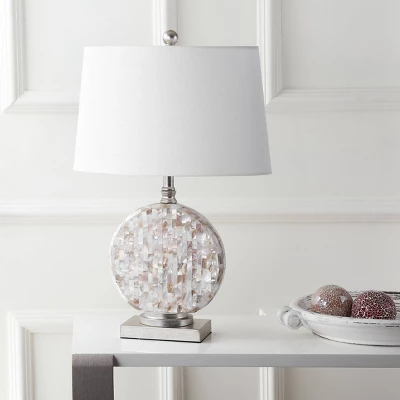 The Jonathan Y Dennis Table Lamp brings a touch of seaside luxury to any room. Expertly crafted with iridescent mother-of-pearl shell tiles over a sturdy metal base, this lamp offers a unique personality that bridges the gap between traditional silhouette and modern coastal glam. The neutral tones of champagne, cream, and ivory shimmer beautifully when illuminated, creating an inviting atmosphere in your living space or bedroom.