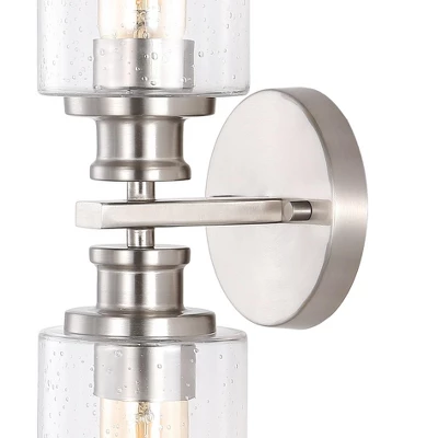 Add vintage Art Deco flair with our classic industrial-style nickel wall light. Two Edison-style LED bulbs in clear glass cylinders provide plenty of light. Mount this versatile wall sconce horizontally over a sink, or vertically beside a mirror or doorway. Clean lines and a nickel finish add modern French style to your bath vanity, kitchen, hallway or entry.