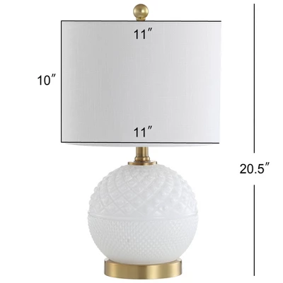 Part of the prestigious JONATHAN Y collection, the Julienne table lamp seamlessly blends antique charm with modern sophistication. Featuring a textured globe reminiscent of classic hobnail milk glass, this fixture is elevated by a sleek brass pedestal and a crisp linen drum shade, making it a timeless addition to any contemporary space.