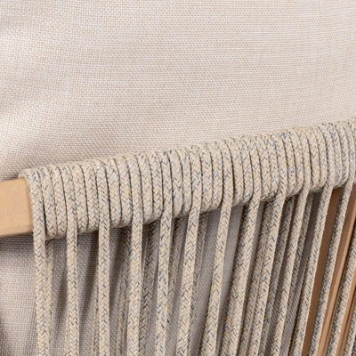 An inspired mix of rustic and modern styles, our bar-height dining set features two tub-shaped barstools and a table. This unique design combines the textures of rope webbing and natural wood grain on a sturdy acacia wood frame. The contemporary silhouette features comfortable back and seat cushions covered in outdoor fabric.