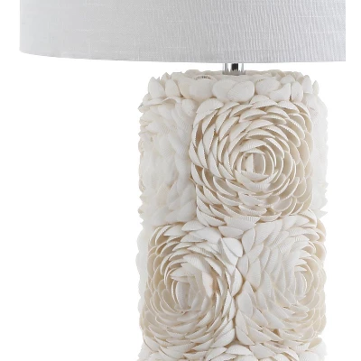 The JONATHAN Y Rosette Table Lamp brings the serene beauty of the coast into your living space with artisan-level sophistication. Featuring intricate rosettes hand-crafted by skilled makers in a stunning mosaic of natural seashells, this piece transforms a classic column silhouette into a romantic statement of style. Complemented by a crisp white textured linen shade and an elegant acrylic pedestal, it offers a sophisticated blend of natural textures and modern luxury that serves as both a functional light source and a work of art.