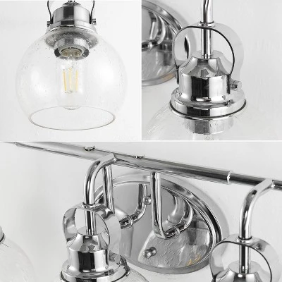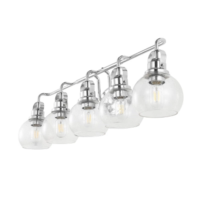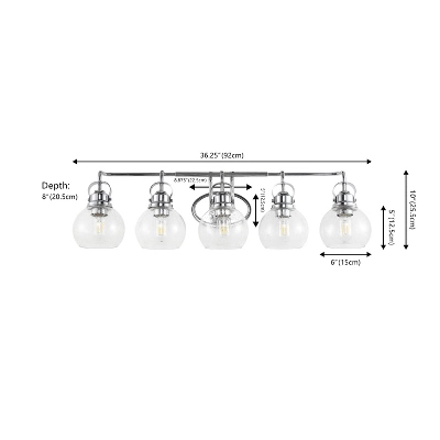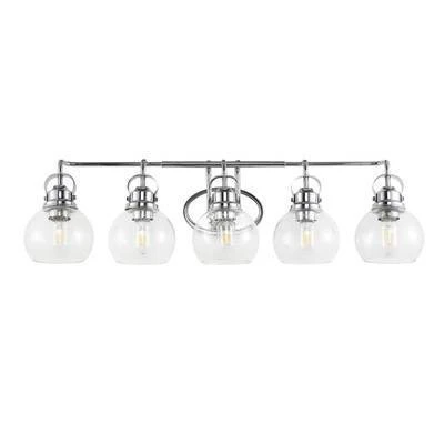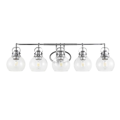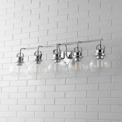Elevate your bathroom or hallway with the JONATHAN Y Shirley 5-Light Vanity Light. Inspired by the timeless lanterns of New England shores, this fixture combines classic coastal charm with high-end modern materials. The striking chrome finish and seeded glass globes create a welcoming glow, perfect for brightening up your morning routine or guiding the way in a hallway. Designed to withstand humidity, this piece offers both enduring style and reliable performance for your home.