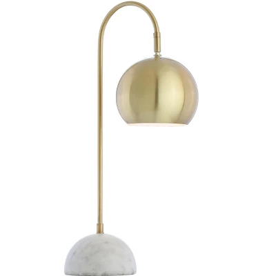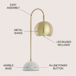 Placed atop the decorative marble base like a pedestal, the arched brass arm and shade of this modern task lamp demands attention in any setting. This metal and marble accent lamp boasts an energy-efficient LED compatibility, giving a sustainable and chic touch to your decor. Style extends all the way to the plug, with a silk-wrapped cord that is too beautiful to hide behind furniture!